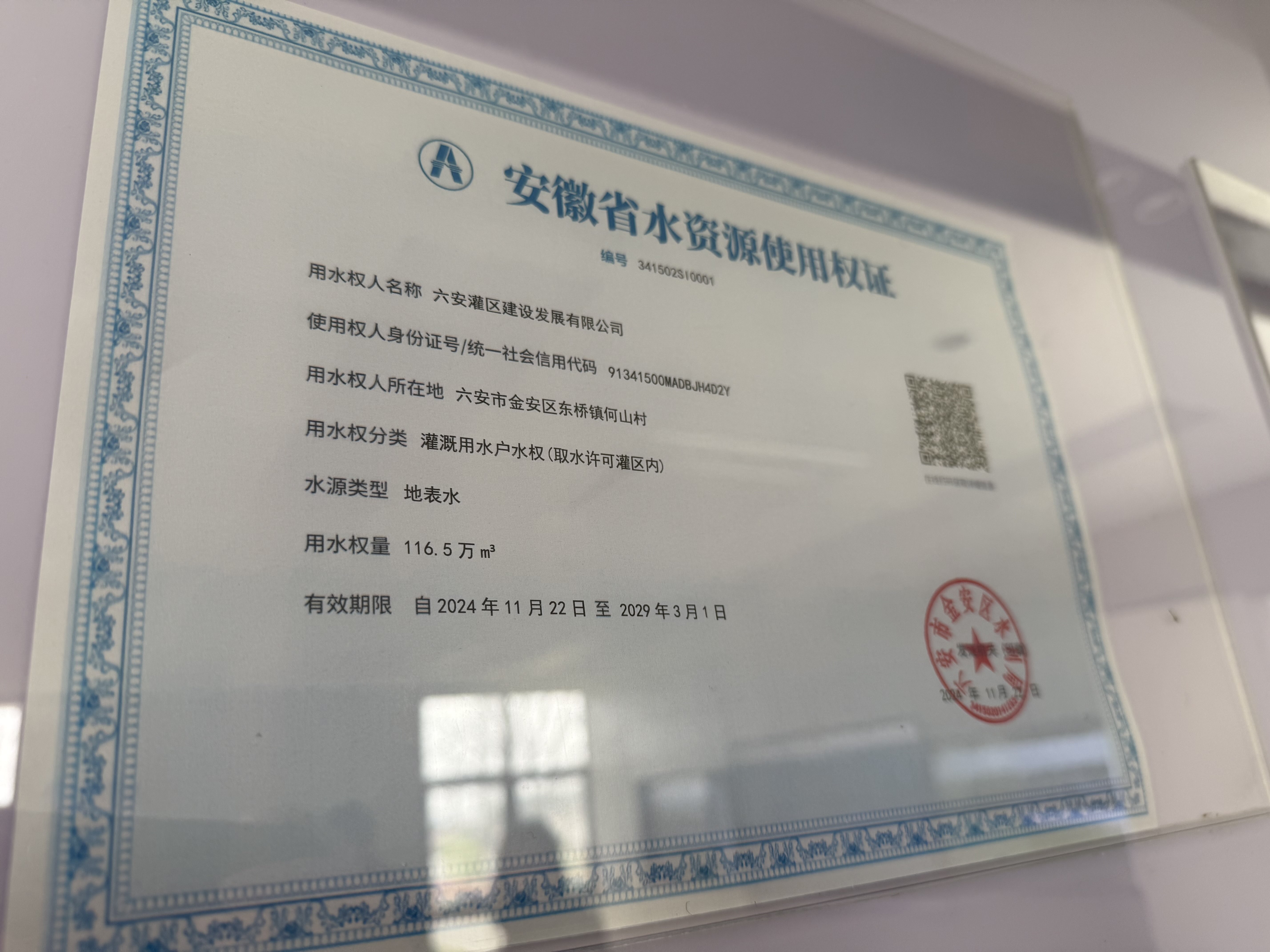 在何山村,封面新闻记者注意到一张编号为“0001”的水资源使用权证。六安市金安区水利局党组成员张应文告诉记者,这是安徽省发出的首张水资源使用权电子证照,用水权人为六安灌区建设发展有限公司,用水权量为116.5万立方米。
