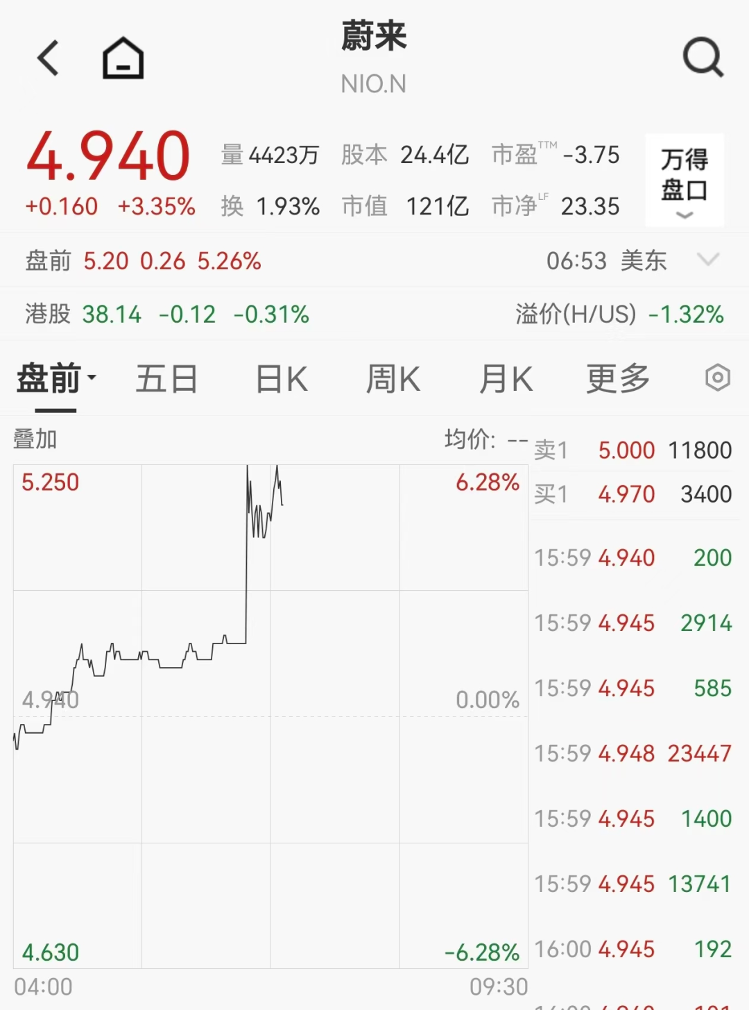 3月10日晚上,蔚来美股盘前直线拉涨,截至18:55,涨幅约5.3%。前一交易日蔚来美股涨3.35%。